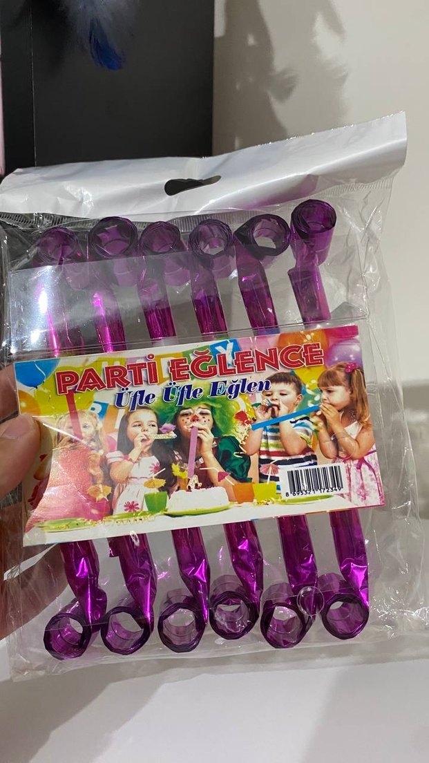 Mor renkli, 12 adet parti düdüğü içeren set. Canlı renklerle kutulanmış, üzerinde 'PARTILECLENCE' markası bulunur.