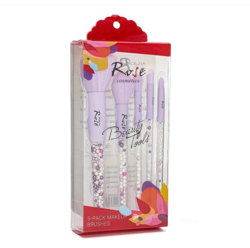 Rose Cosmetics'ten, içi boncuk dolu şeffaf saplı, mor pastel renkte 5'li makyaj fırçası seti.