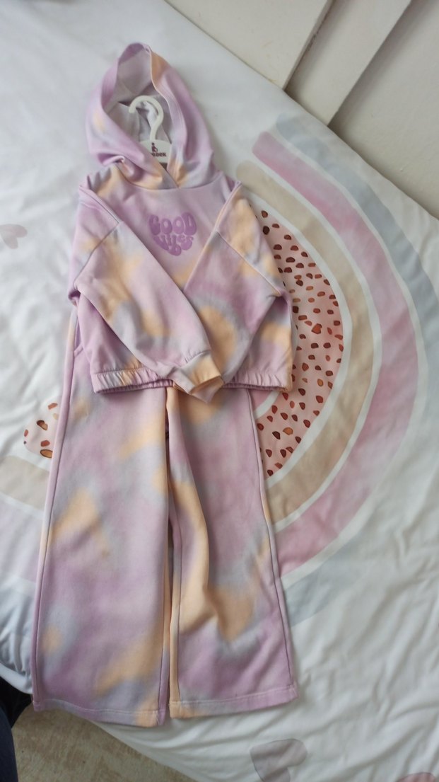Mor tonlarında pastel batik desenli, kapüşonlu ve uzun kollu sweatshirt ile bol kesim eşofman takımı. Yumuşak ve sıcak kumaştan, sokak modasına uygun.