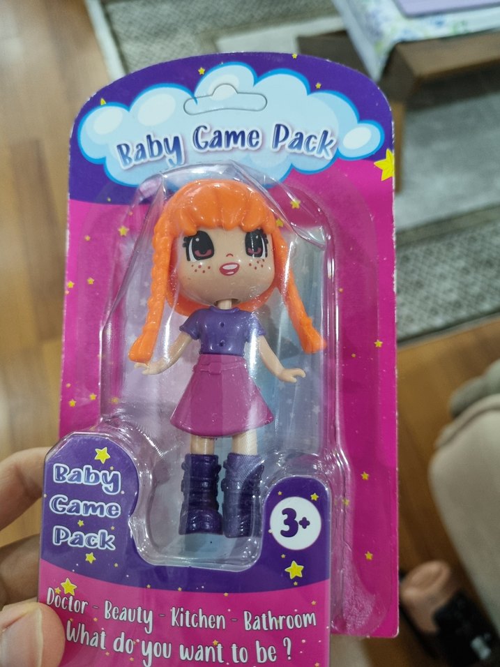 Turuncu örgülü saçlı, pastel mor renkli bebek oyuncak. Baby Game Pack ambalajında, 3 yaş ve üzeri için uygundur.