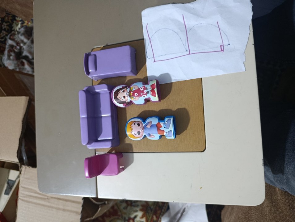 Mor pastel renkte küçük mobilya parçaları ve iki küçük karakter figüründen oluşan oyuncak seti.