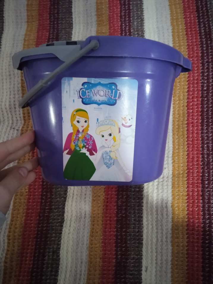 Gri saplı, mor pastel renkte çocuk kovası. Üzerinde çizgi karakterlerin olduğu renkli bir etiket ve CEWORLI yazısı bulunur.