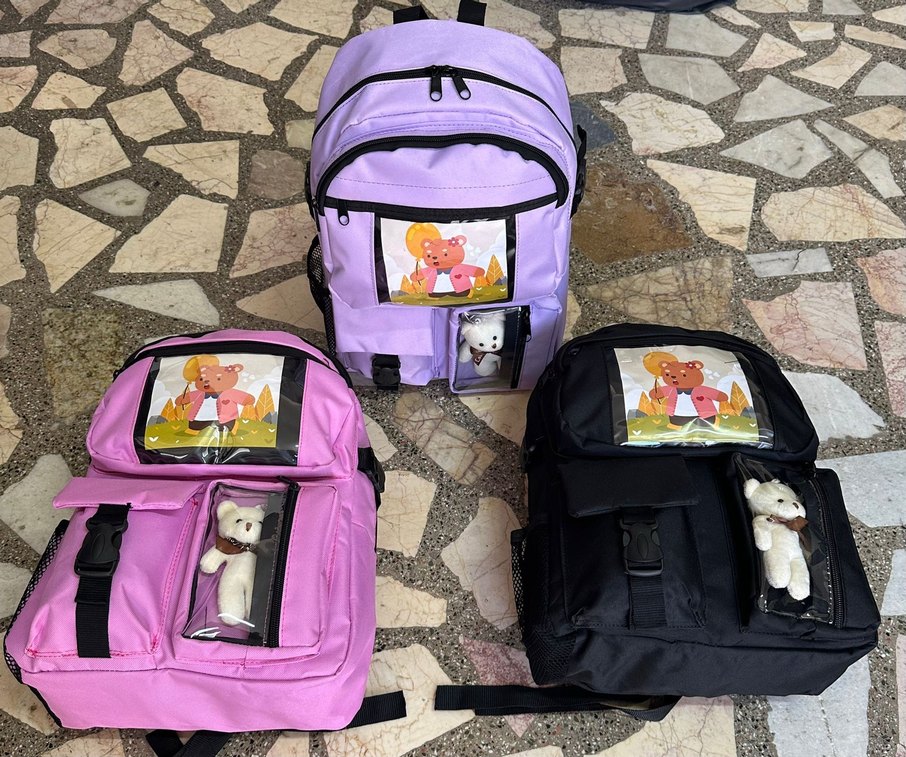 Mor pastel çocuk okul sırt çantası, çoklu fermuarlı bölmeler ve küçük oyuncak ayıcık içeren şeffaf cep ile.