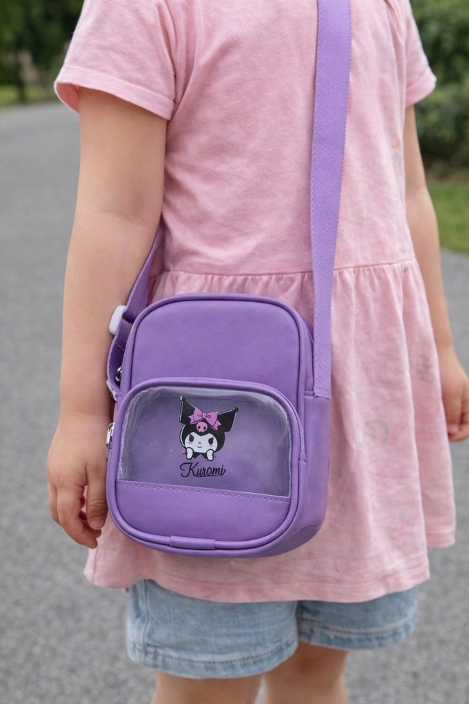 Pastel mor renkte, önünde sevimli bir karakter baskısı bulunan şeffaf cepli ve ayarlanabilir askılı çocuk okul çantası. Kuromi çocuk çantası