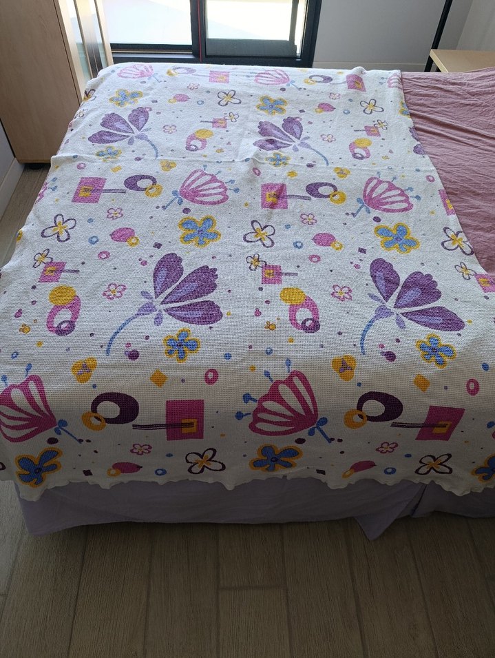 Tek kişilik pike, mor pastel zemin üzerine kelebek ve çiçek desenli Pike ve yatak örtüsü. En 155,boy 255 cm.