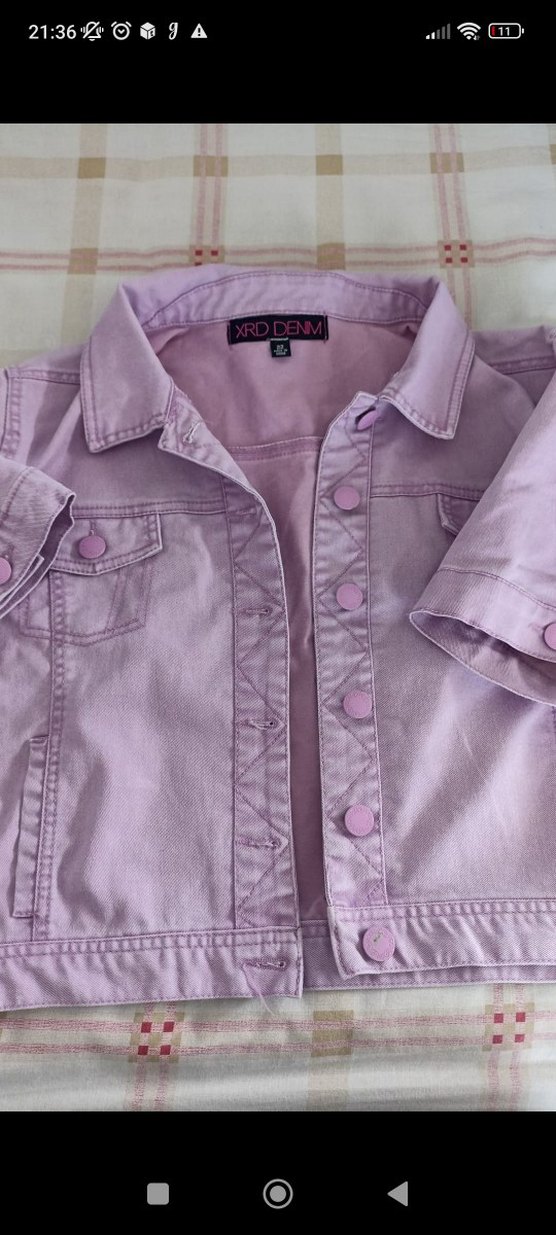 Mor pastel renkte, düğmeli, kısa kollu ve kesimli yakalı kadın denim ceketi. Normal boyda, günlük rahat sokak stili için uygun. Marka: XRDDENM.
