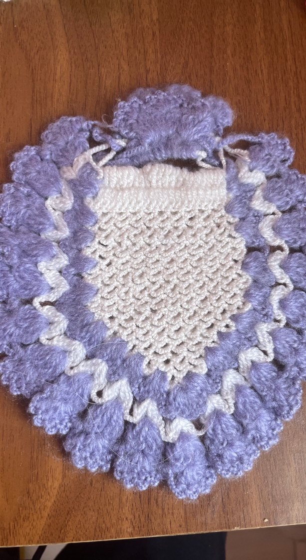 Pastel mor renkte, yumuşak iplikten el örgüsü banyo süngeri, dokulu ve dekoratif tasarıma sahip.