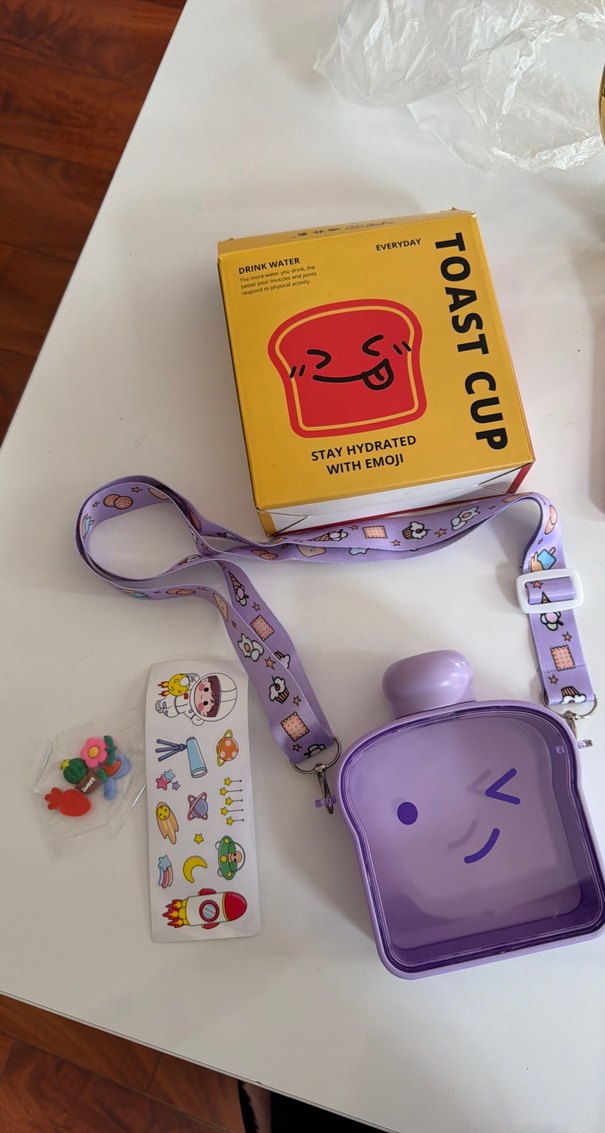 Mor pastel renkte, emoji desenli çocuk termos şişesi. Ayarlanabilir askı ve eğlenceli çıkartmalarla birlikte gelir.