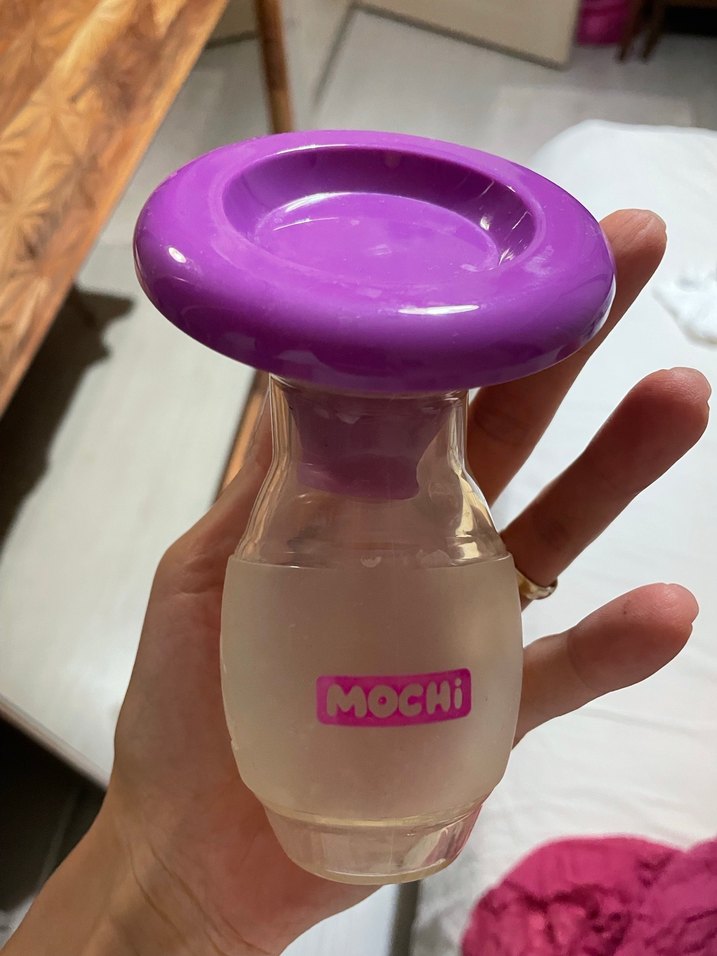 Mor pastel renkte, rahat kullanım için yumuşak silikon kenarlı kompakt göğüs pompası. Şeffaf şişede Mochi markası bulunur.