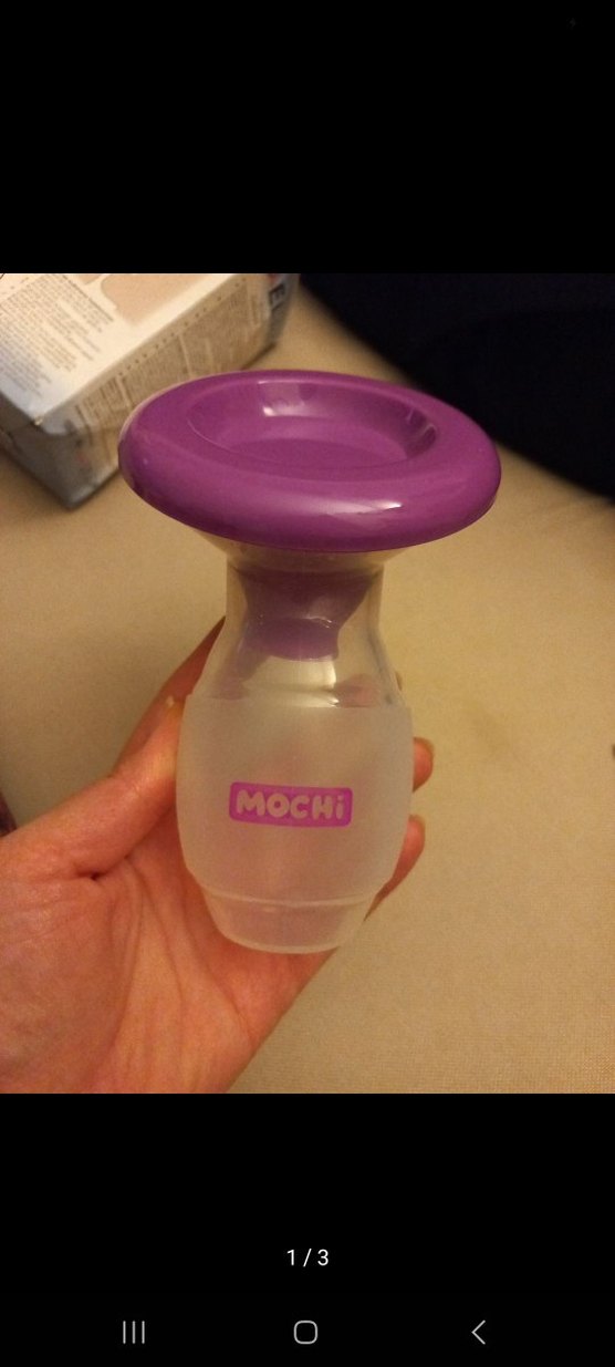 Mor pastel yumuşak kenarlı ve Mochi marka şeffaf şişeli göğüs pompası, rahat kullanım sunar.