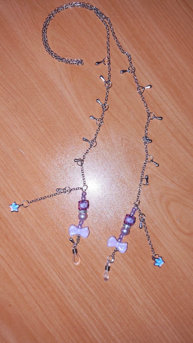 Mor pastel renkli, gözlük zinciri, işleme desenli ve boncuklu detaylarla günlük kullanıma uygundur.
