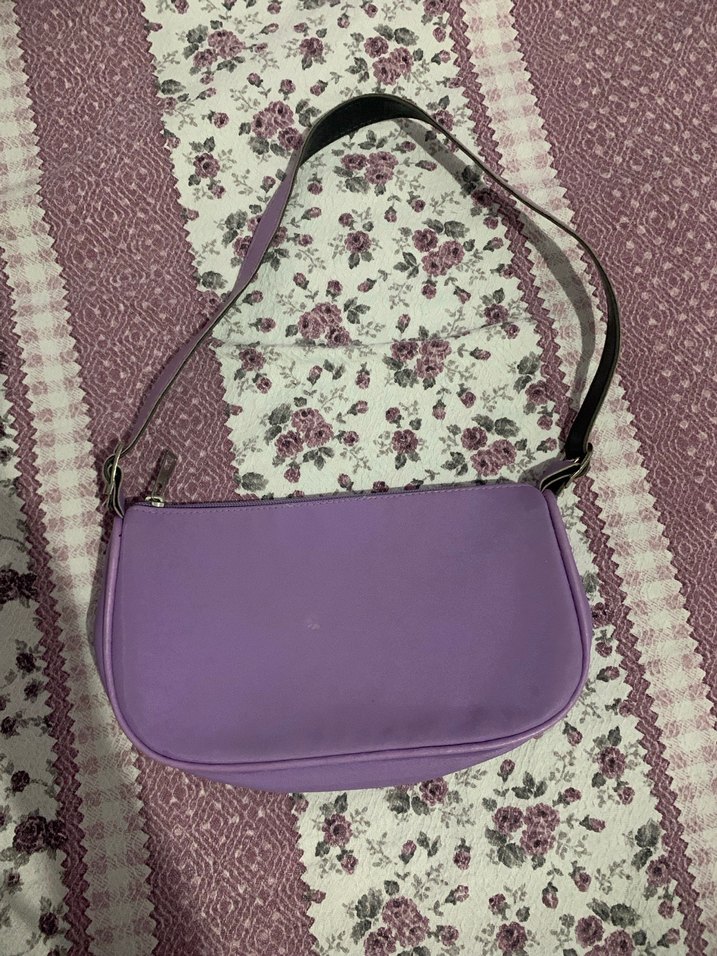 Mor pastel renkli, sentetik kumaştan yapılmış, tokalı askısı ve minimalist tasarımıyla günlük sokak modasına uygun bir kadın omuz çantasıdır.