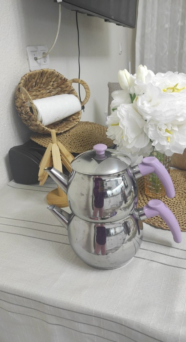 Paslanmaz çelikten yapılmış, mor pastel kulplu ve kapak düğmeli çaydanlık. Dayanıklı ve şık bir tasarıma sahiptir. ☕