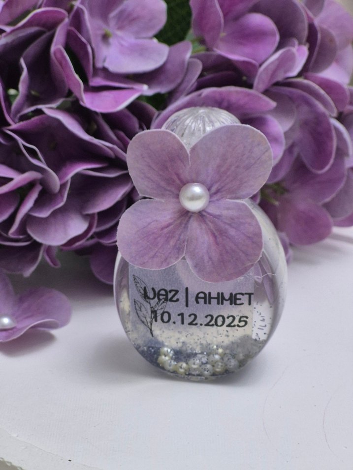 Pastel mor renkte, inci detaylı çiçek süslemeli nikah nisan süsü.