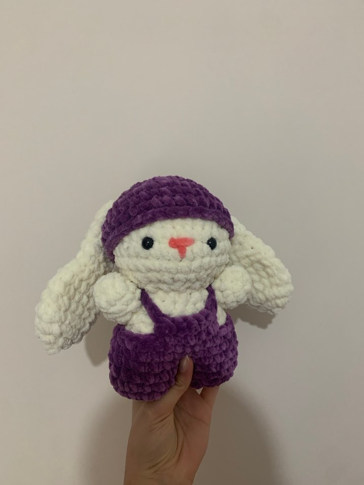 Yumuşak beyaz peluş, mor tulum ve şapka giymiş pastel mor tavşan oyuncak. Sarılmak için uygun yumuşak dokuya sahip.
