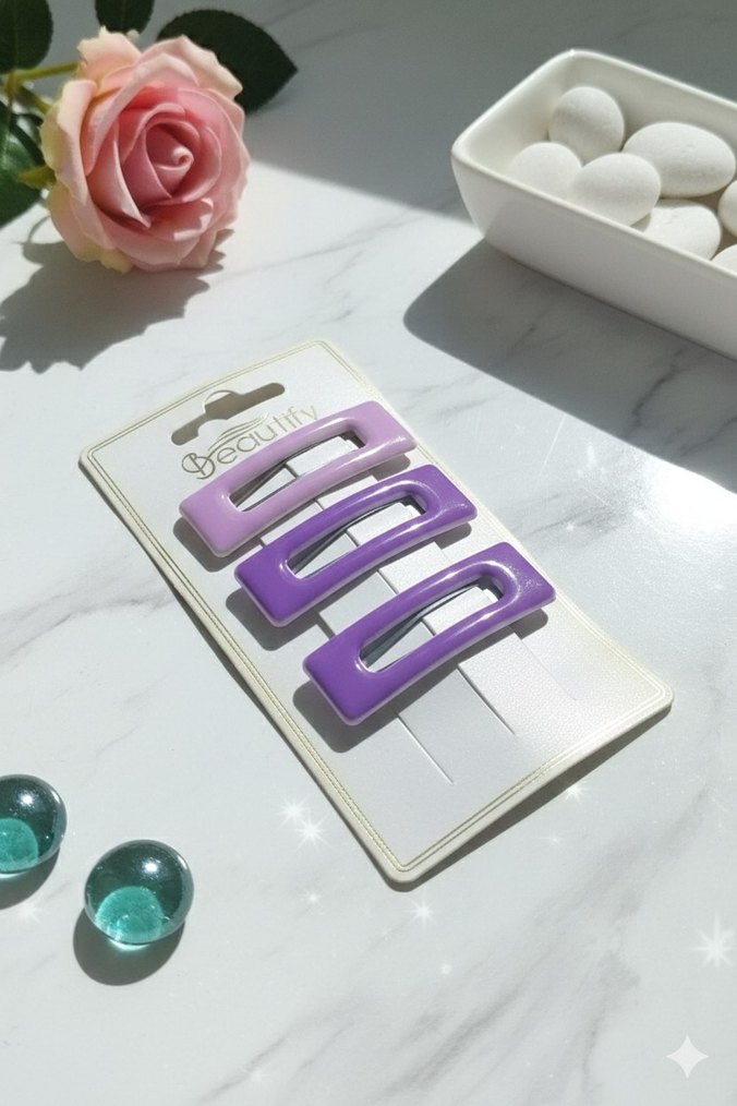 Minimalist tarzda, elastik özellikli, mor pastel renkte üçlü plastik saç tokası seti. Sade ve günlük kullanım için uygun.