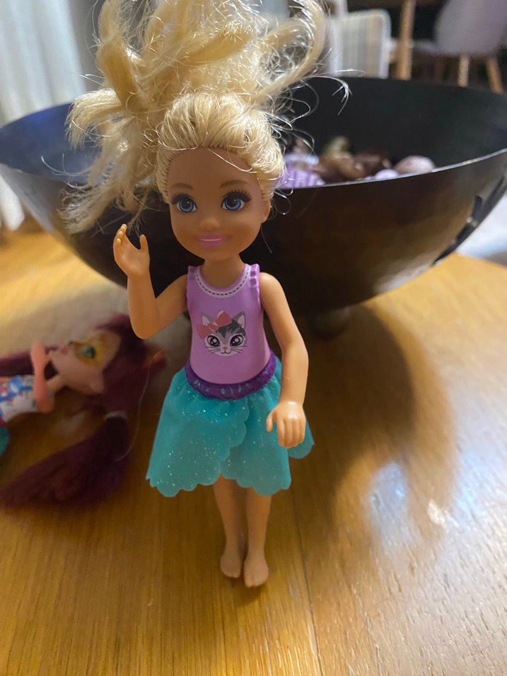 Bu bebek, üstünde kedi deseni olan mor pastel renkli kıyafet ve açık mavi etek ile birlikte gelir. Sarı saçlıdır ve oyun için uygundur.