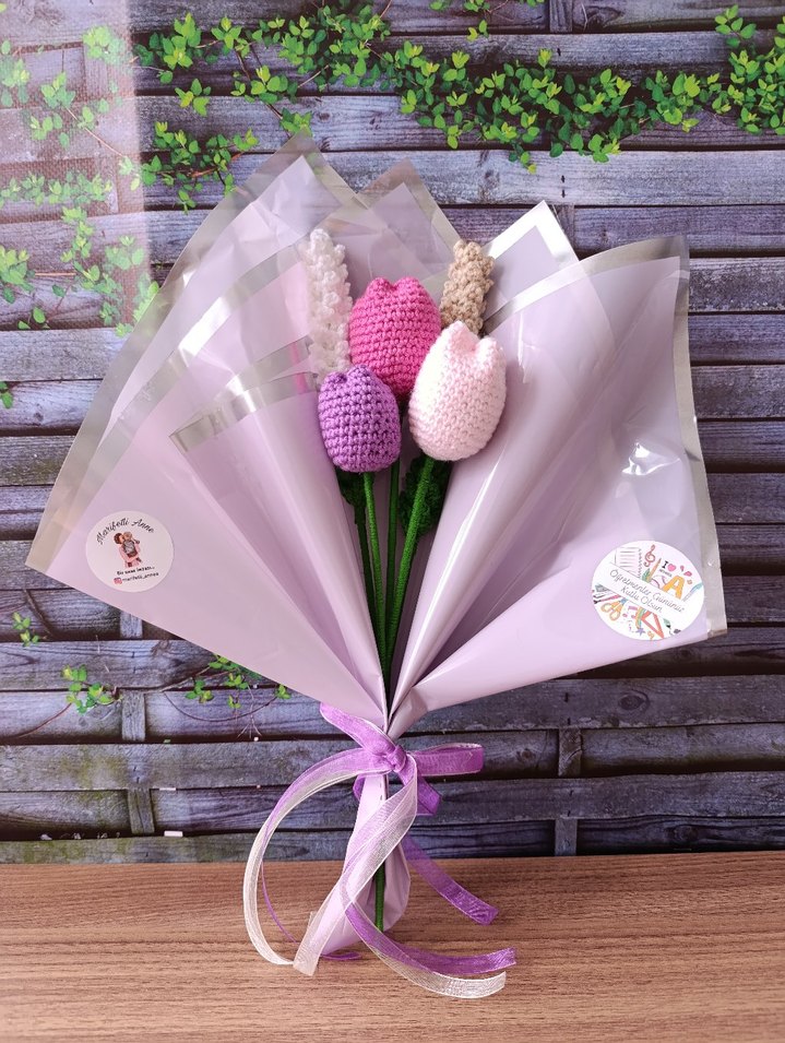 Mor pastel renkli şeffaf kağıda sarılı, mor ve pembe tonlarında örgü çiçeklerden oluşan buket, mor ve beyaz kurdeleyle bağlanmıştır. öğretmenler günü hediyesi