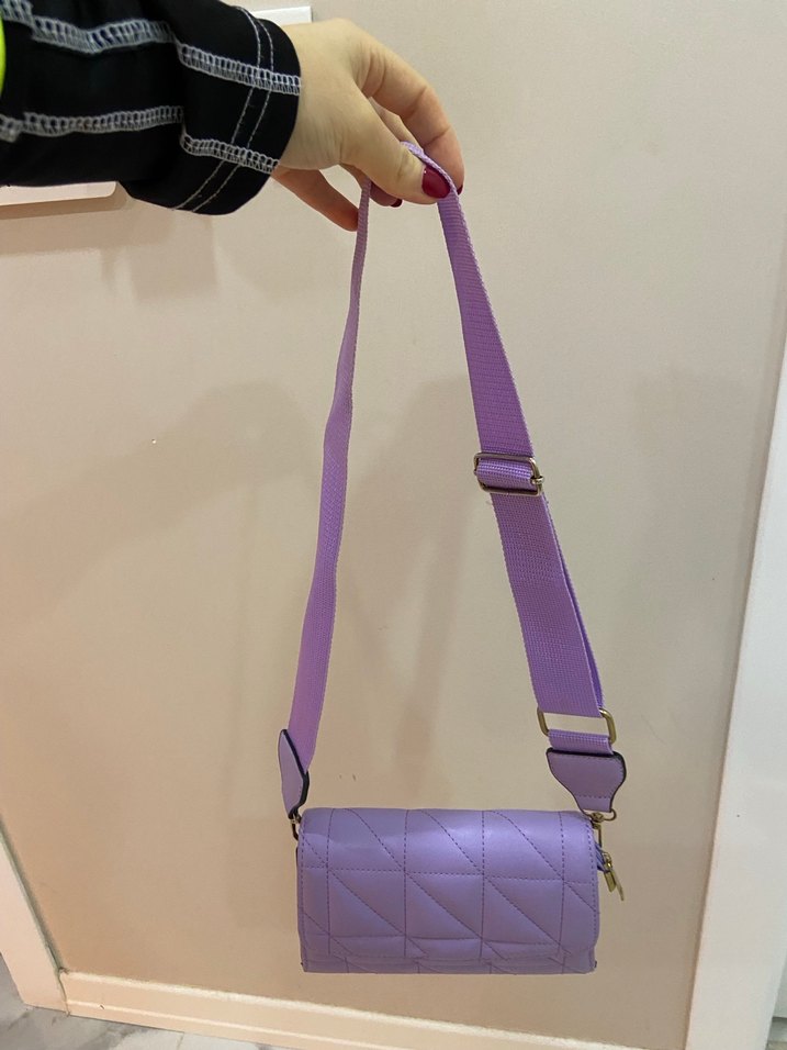 Mor pastel tonlarında, tokalı ayarlanabilir askıya sahip, sentetik kumaştan yapılmış ve kapitone desenli kadın çanta.