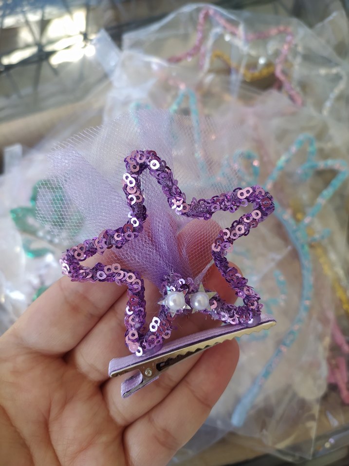 Mor payetler ve boncuklarla süslenmiş yıldız şekilli saç tokası, yumuşak tül kumaşla birleşti. tek fiyatıdır. ikili satış diğer ilanlarimdan bakabilirsiniz.