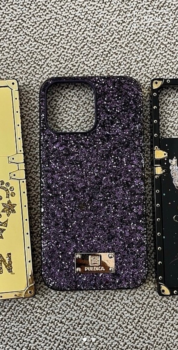 Mor payetlerle kaplı koyu renkli gotik tarzda telefon kılıfı. Metal marka plakası bulunur.