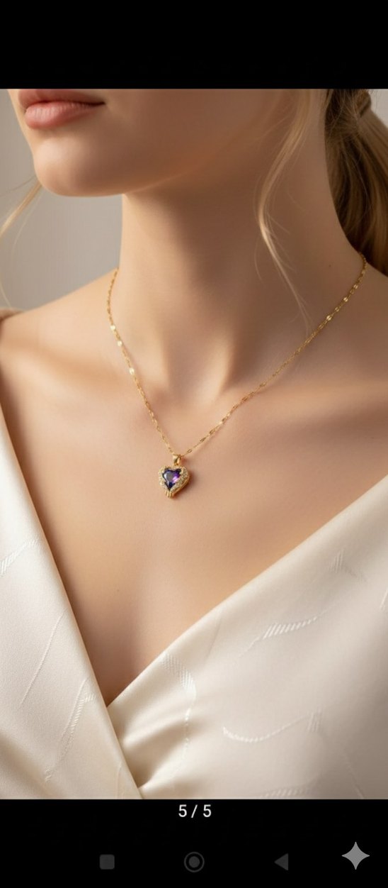 Modern klasik tarzda, mor tonlarda payetli kalp kolye. Altın zincir üzerinde, romantik akşamlar için uygun.