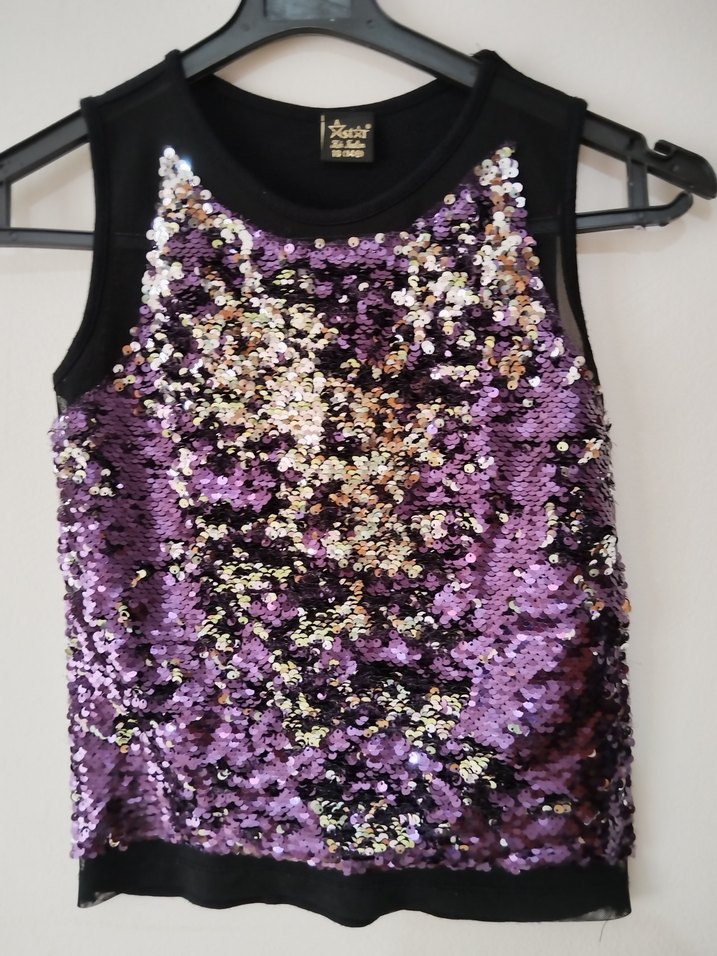 Kolsuz, mor ve gümüş payetlerle kaplı, dar kesim kız yeleği. Sentetik kumaştan, yuvarlak yakalı ve canlı desenli sokak stili. ✨
