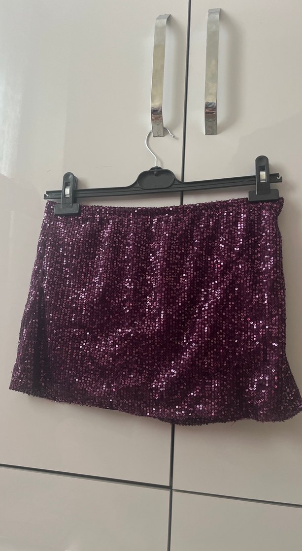 Mor payetli, nakış desenli ve sentetik kumaştan yapılmış, dar kesim mini etek. Bohem ve retro tarzıyla parti için uygun. ✨