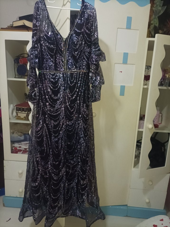 Mor Payetli Uzun Bohem Kadın Elbise abiye L beden