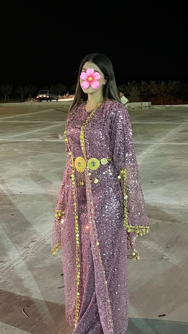 Mor renkli, payet işlemeli, uzun kollu ve V yakalı bol kesim kına elbisesi. Etnik desenlerle süslenmiş, gösterişli parti kıyafeti. ✨