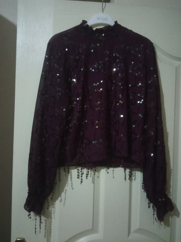 Mor renkte, uzun kollu, yüksek yakalı ve payet işlemeli bol kesim bluz. Sentetik kumaştan, bohem ve retro tarzlara uygun, parti için ideal. ✨