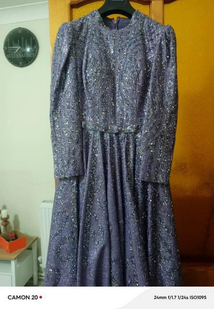 Mor payetli işlemeli uzun kollu, bol kesim kadın abiye elbise. Yuvarlak yaka ve parlak, göz alıcı bohem tarzıyla düğünler için uygun. ✨