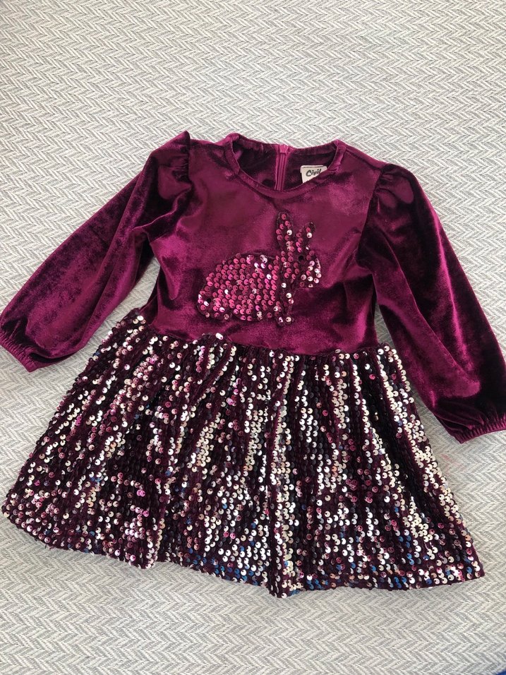 Mor renkli, uzun kollu ve V yakalı kız elbisesi, yumuşak sentetik kumaştan. Nakış detaylı ve parlak payetli etek kısmı, rahat kesimle şık bir görünüm sunar.