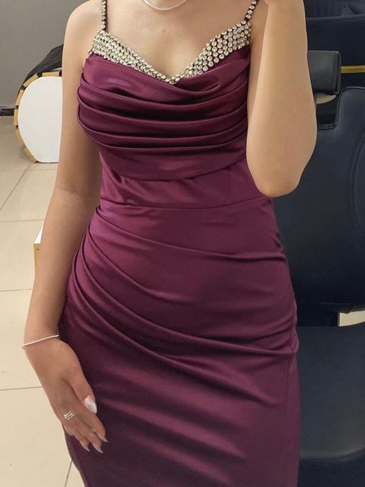 Mor, payetli ve nakışlı detaylara sahip, V yakalı, ince askılı, boy uzunlukta, vücuda oturan abiye elbise. ✨