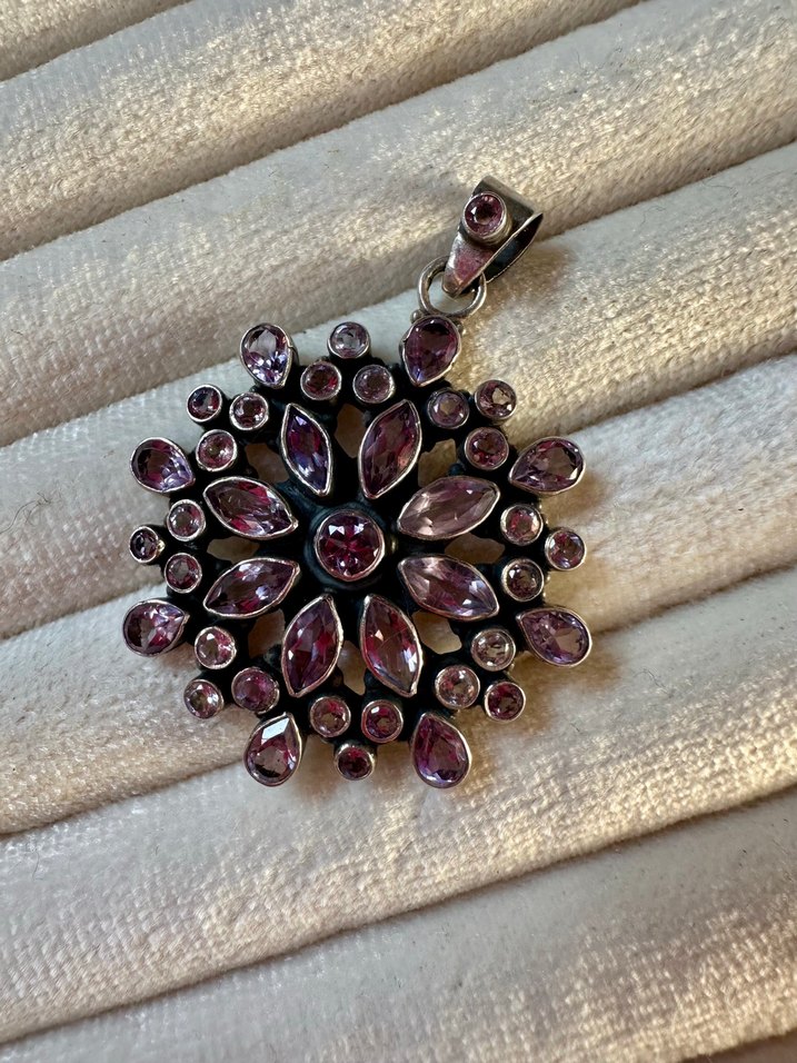 Koyu mor renkli, payetli ve bağlama deseninden esinlenen vintage bohem tarzda kolye ucu, günlük kullanıma uygundur.