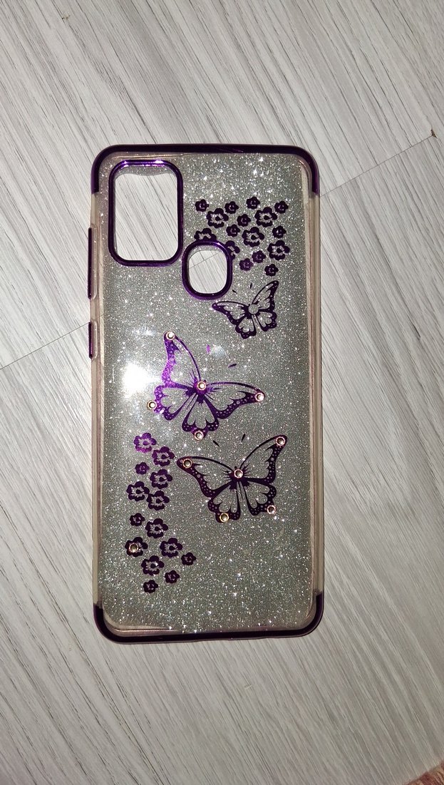 Mor payetli, kelebek ve çiçek desenli vintage tarzda telefon kılıfı, ışıltılı bir görünüm sunar.