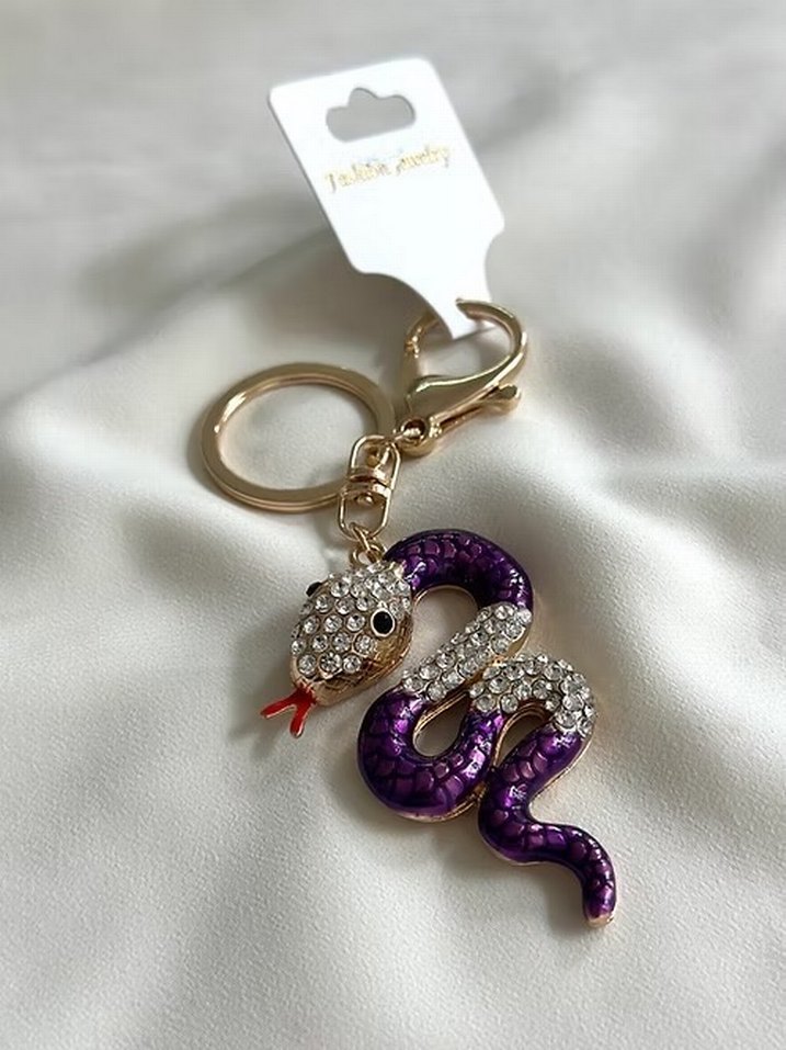 Mor renkte, payet ve parlak taşlarla süslenmiş yılan figürlü anahtarlık. Bohem ve rock punk tarzını yansıtıyor.