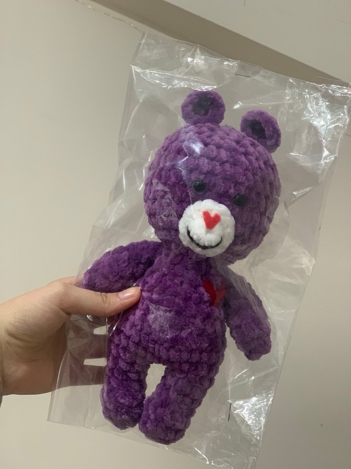 Renkli mor peluş ayı oyuncak, yumuşak dokusu ve burnundaki küçük kırmızı kalp detayı ile sarılmak için uygun. %100 el örgüsü