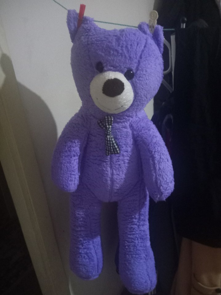 Yumuşak ve renkli mor peluş ayıcık oyuncak, ekoseli papyon detayıyla sarılmak için uygun.