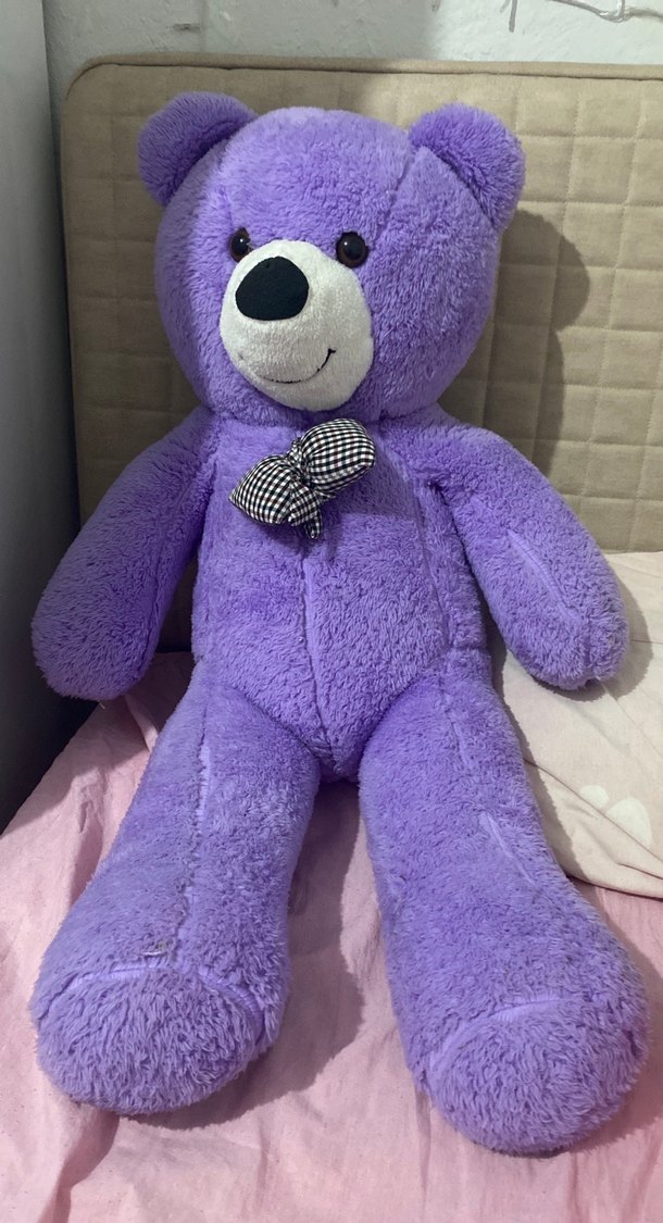 Yumuşak ve renkli mor peluş ayıcık, ekose fiyonk detayıyla sarılmak için uygun.