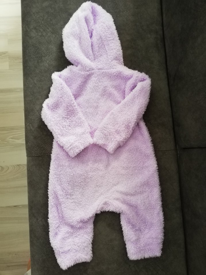 Pastel mor renkte, peluş dokulu, kapüşonlu uzun kollu bebek tulumu. Desensiz sade ve rahat bir tasarıma sahiptir.