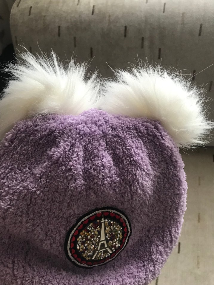 Mor peluş çocuk beresi, beyaz kürk ponponlu ve nakışlı Eyfel Kulesi rozetiyle. Yumuşak, sıcak ve retro bohem tarzda. ❄️el örgüsü