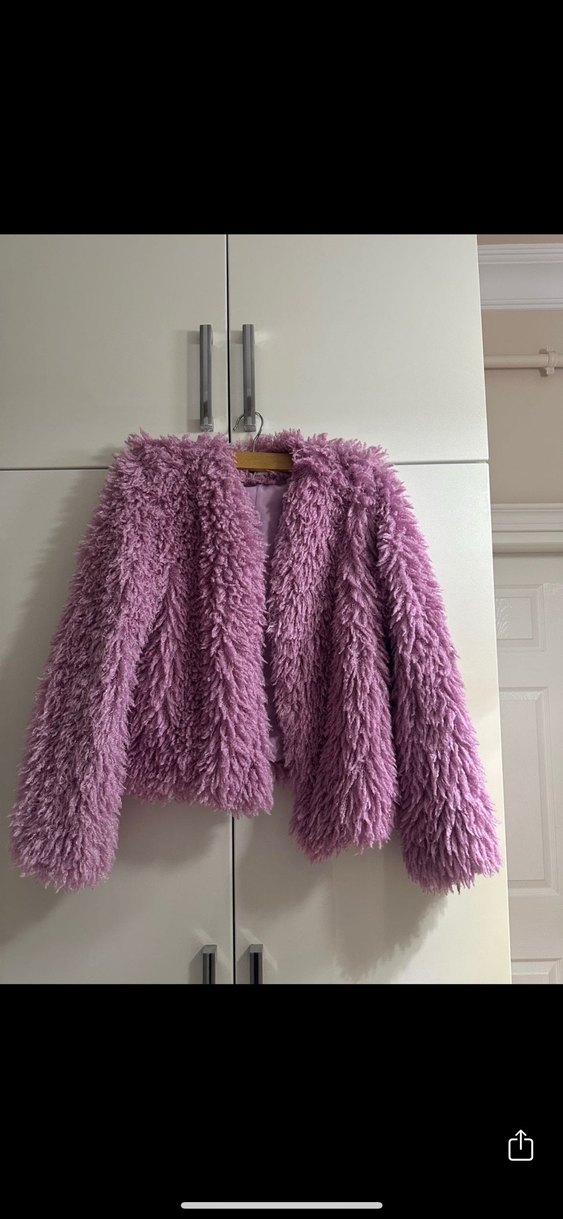 Pastel mor renkte, peluş detaylı yumuşak dokulu kadın kaban. Uzun kollu, kesimli yaka ve bol, midi boyda bohem tarzda.