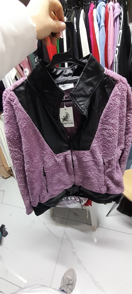 Mor peluş kumaş ve kürk detaylı, yüksek yakalı, uzun kollu, bol kesim kadın mont. Sokak stili ve günlük kullanım için uygun BEDENLERİ MEVCUTTUR XS S M L XL deri detaylı