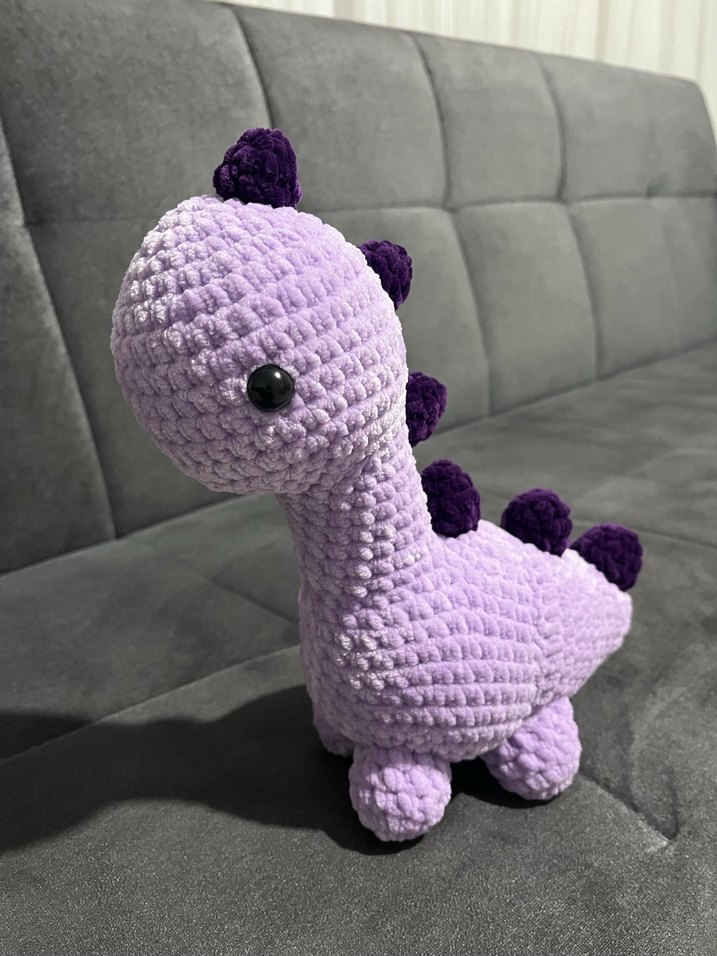 Pastel mor renkte, koyu mor detaylı yumuşak peluş dinozor oyuncak. Dokulu yüzeye sahip, sevimli görünümlü.