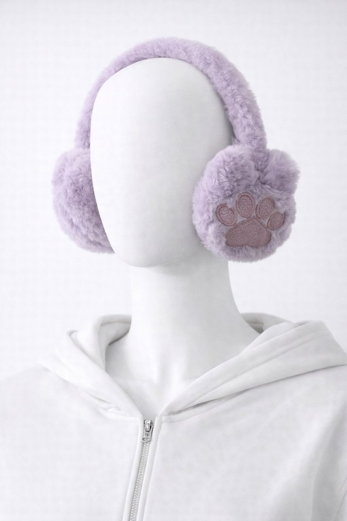 Pastel mor peluş kedi kulaklığı, pati deseniyle yumuşak ve rahat.