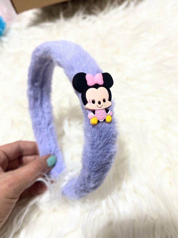 Mor peluş detaylı, renkli ve işlemeli Minnie figürlü çocuk taç, pop kültür havası katıyor.