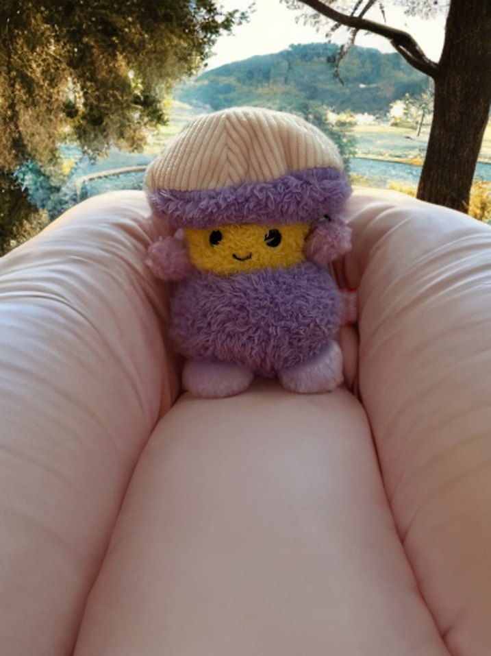 Yumuşak pastel mor renkte, şapkalı ve gülen yüzlü peluş oyuncak. Rahatlatıcı ve dekoratif amaçlı idealdir.