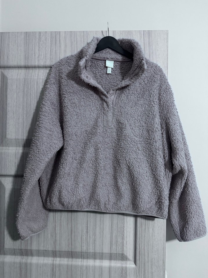 Mor peluş kumaştan yapılmış, yüksek yakalı ve uzun kollu, bol kesim bir kadın sweatshirtüdür. Günlük kullanım için rahat ve sade bir tarza sahiptir.