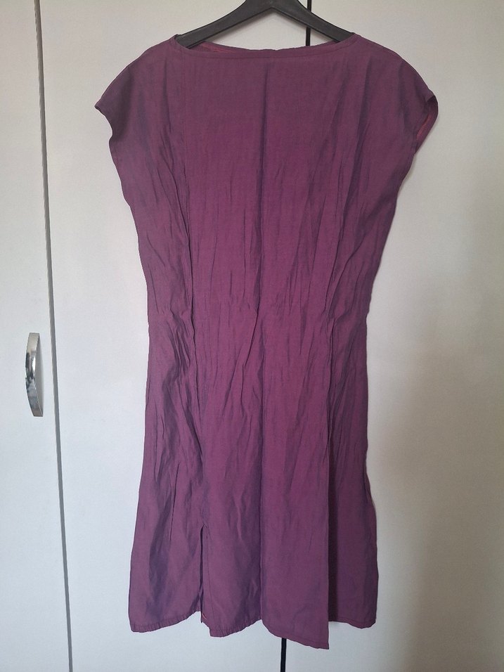 Mor pembe arası yazlık kumaştan, kolsuz, bol kesim midi elbise. Minimalist ve bohem tarz için uygundur. 36 bedene uygun. 1 2 kez kullanıldı özel dikim. ihtiyaç fazlası